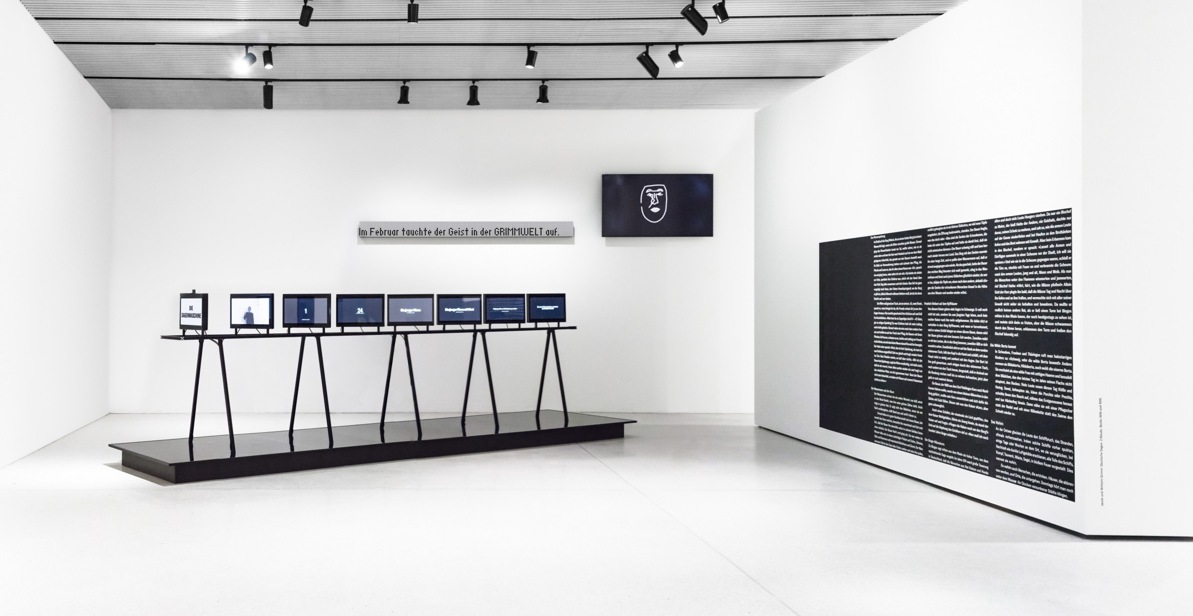 The "Sagenmaschine" is a linear deconstruction process that breaks down an input image into its individual parts, performs a text analysis, compares results with data sets and constructs a new output. Unavoidable disturbances and noise lead to unexpected results. Viewers are captured via a camera image. The biometric features are extracted in a digital narrative, displayed on ten display devices and intertwined with a legend by the Brothers Grimm. Thus, the machine constantly creates new legends with the viewers as protagonists.
